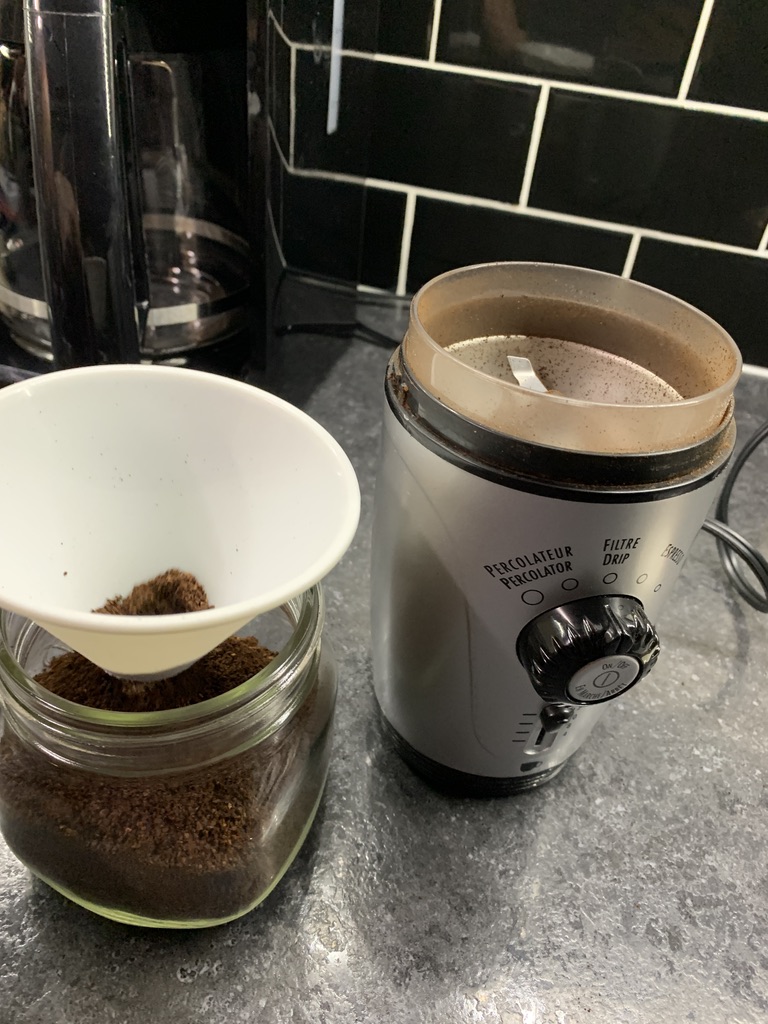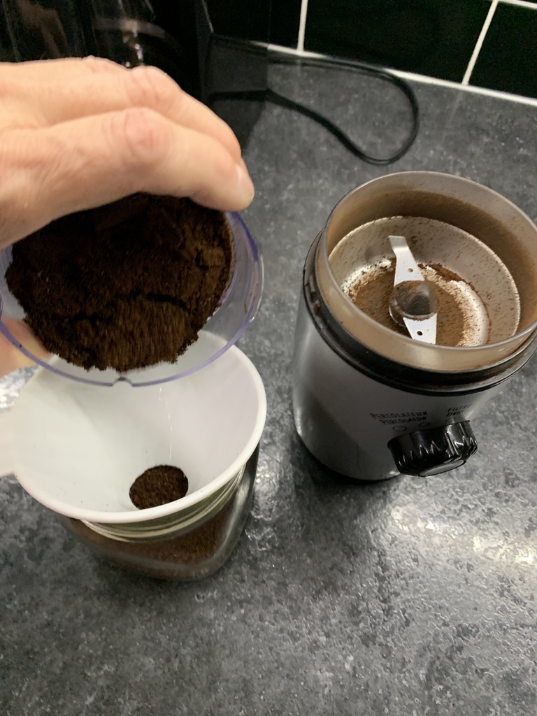 As I ground coffee I was reminded of this when I took out the plastic funnel I use to guide the coffee into its holding place. This funnel once had a narrow neck until I cut it off. My first (unsatisfactory) effort involved a kitchen knife. Months later I tried again more carefully, smoothing the cuts from that first effort. I thought again about the shiny metal funnel, deciding that “I’ll put it on my Christmas list!” I thought about that; why not just buy it? How did I get here?
